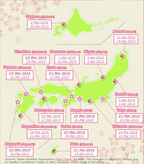 A Japán Meteorológiai Szolgálat hétfőn bejelentette, hogy a szigetországban leggyakoribb, és így viszonyítási alapként szolgáló Somei Yoshino cseresznyefa virágot bontott – két nappal korábban, mint 2015-ben –, ezzel hivatalosan is megkezdődött Japán egyik legnagyobb ünnepe, a Hanami, amikor japánok milliói lepik el a parkokat és az utcákat, hogy a virágba borult fákat csodálják. A virágzás idején a híradók részletesen beszámolnak róla, hol és mikor fog kipattanni az első bimbó, hányad részben nyíltak már ki a virágok, és mikorra várható az elvirágzásuk.