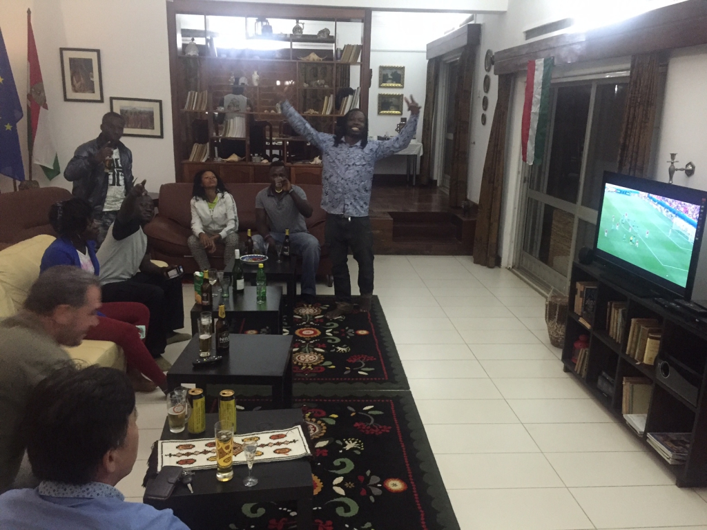 Sokan a helyiek közül, akik már ismerik a kampalai magyar házat, automatikusan üzennek vagy telefonálnak, amint rúgunk egy gólt, vagy sikerrel zárunk egy meccset. Ezért a portugálok elleni meccsre már egy magyar Eb-napot tartottunk, ahol a résztvevők szétrobbantották fergeteges hangulatukkal a házat. Koreaiak, ugandaiak, kenyaiak, ruandaik mellett természetesen a Kampalában tartózkodó néhány magyar is részt vett a közös szurkolásban. Egyszerre dobbant mindenki szíve a magyar csapatért és lopva elcsenhettek valamit afrikai barátaink abból az érzésbombából, amit mi kapunk, amikor a csapatunk pályára lép és szívvel-lélekkel küzd Magyarországért, a szurkolókért és egymásért is.