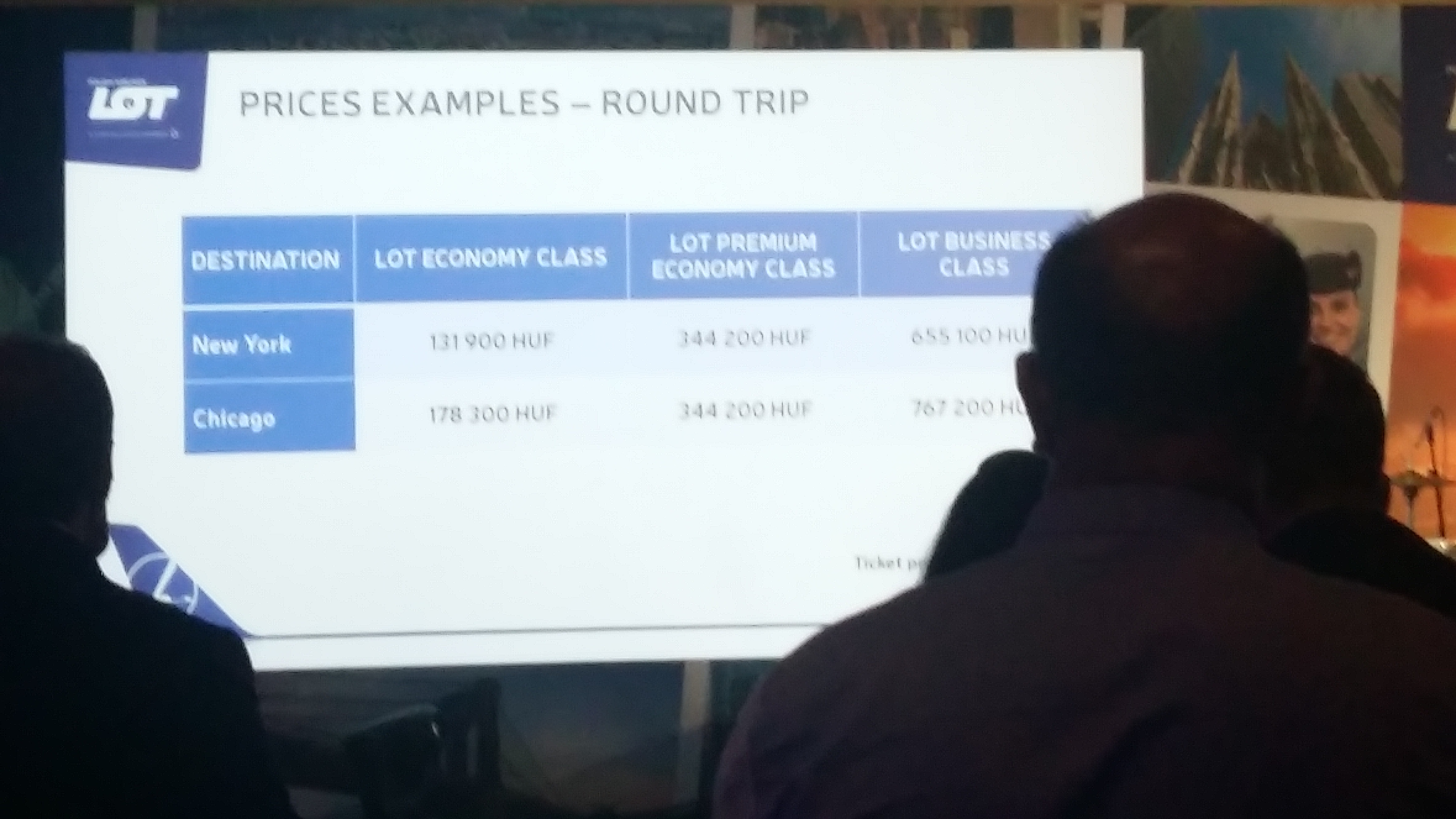 Az új járatok részleteiről a LOT operatív igazgatója, Maciej Wilk beszélt. A többi között elmondta, hogy ezek cargo lehetőséget is tartogatnak: nagyjából 12 tonna árut tudnak szállítani egy út alatt. A tervek szerint az év feléig 60 magyar légiutas-kísérő teszi meg a Budapest – New York és a Budapest – Chicago utat – az előbbit 9 óra 45 perc, az utóbbit pedig 10 óra 15 perc alatt. Ami pedig az árakat illeti, kezdetben promóciók lesznek, melyeket a kivetítőn is bemutatott: